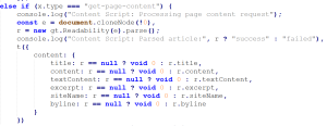 When instructed by the iframe, the extension queries the active tab and invokes a content script that extracts readable article content using Mozilla’s Readability library. The extracted data includes titles, text content, excerpts, and site metadata.