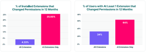 Our data shows that 64% of users have at least one AI extension that changed its permissions in the past 12 months, compared to 34% of users across all extensions. This isn’t a one-time installation risk — it’s a continuously evolving one.