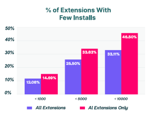 The picture gets even murkier when you look at the reputation signals of the extensions people are running. Almost half of all AI extensions have fewer than 10,000 users — meaning there’s very little community vetting, very little public track record, and very little accountability if something goes wrong.