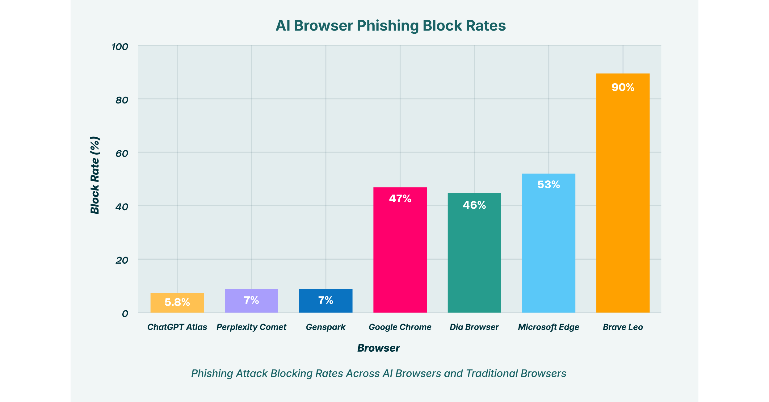 For comparison, Microsoft Edge successfully blocked 53% of the same phishing attempts, while Google Chrome blocked 47%. This performance gap means ChatGPT Atlas users face approximately 90% more exposure to phishing attacks compared to traditional browser users. This inadequacy directly enables the memory poisoning attacks mentioned above, as phishing pages serve as delivery mechanisms for malicious CSRF requests.