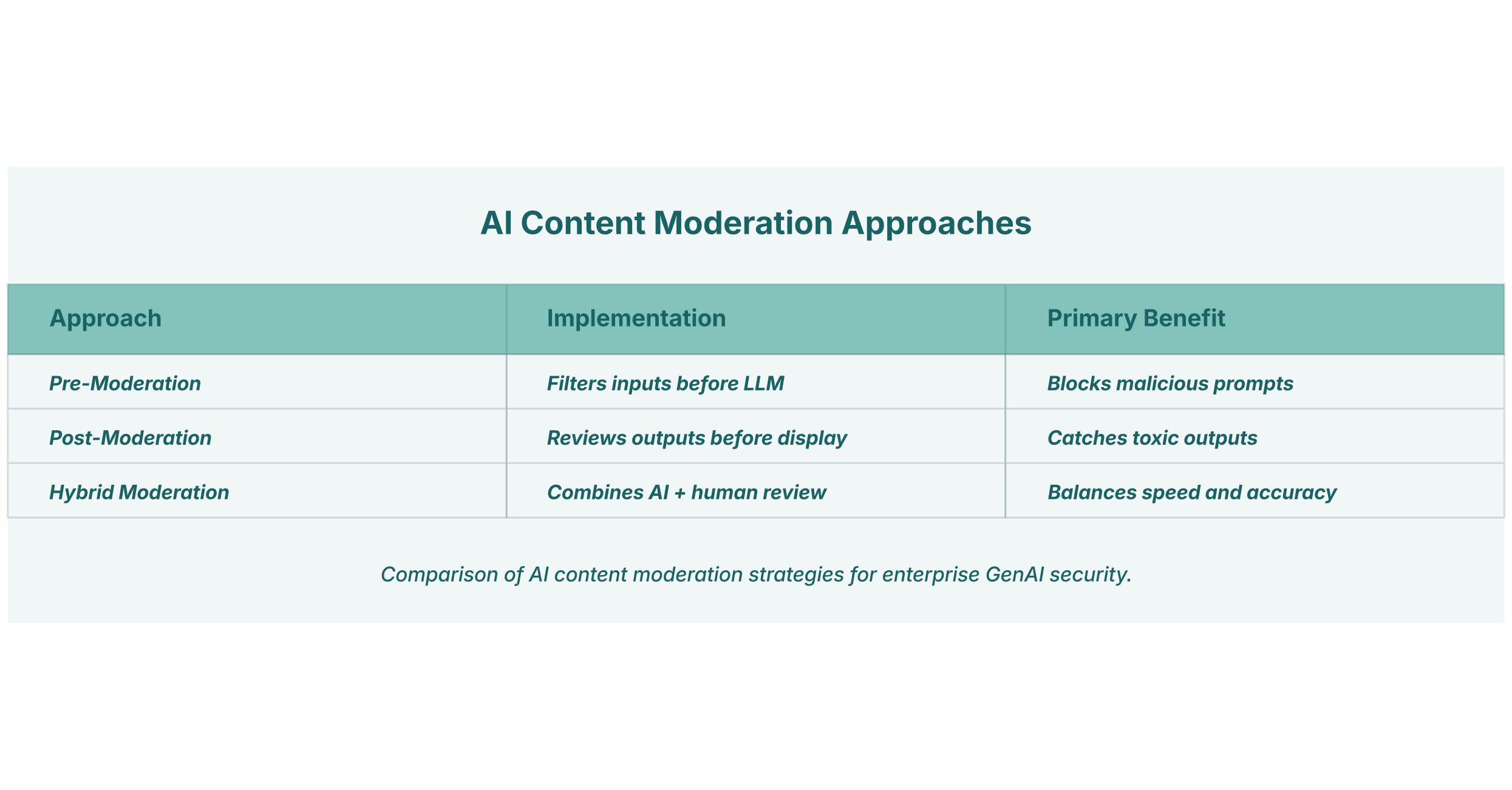- Post-Moderation: Just as important is reviewing the LLM outputs after they are generated but before they are displayed to the user. This step acts as a final safety check to catch any harmful, biased, or toxic content the model may have produced, despite other safeguards.