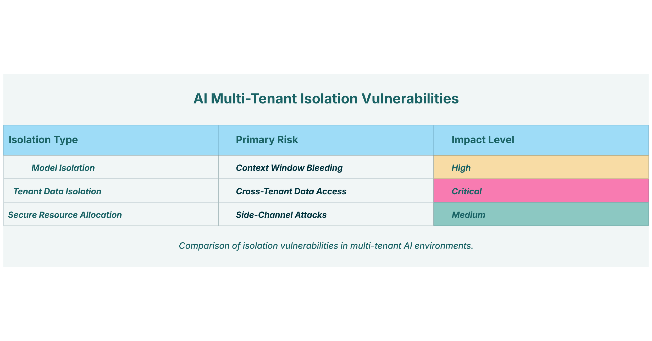 A failure in tenant data isolation is often more direct and catastrophic than a session leak. Consider an AI platform that stores customer data in a large, shared database, relying on a “tenant_id” field in each row to separate the data. If a vulnerability like an SQL injection is discovered, a malicious actor could potentially bypass this logical separation and query the data of every customer on the platform. Similarly, if the provider uses a shared encryption key for multiple tenants, a compromise of that key would expose everyone’s data.