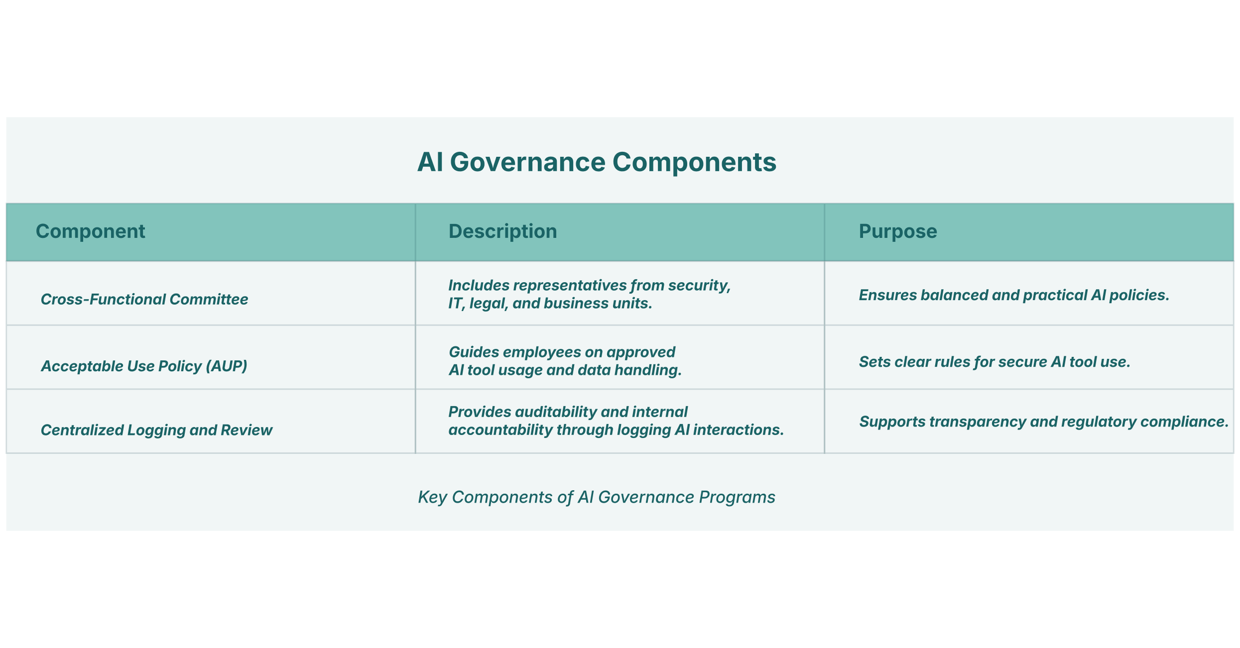 - A Cross-Functional Committee: This committee should include representatives from security, IT, legal, and business units to ensure that policies are balanced and practical. It is responsible for defining the organization’s stance on AI and establishing clear policies for its use.