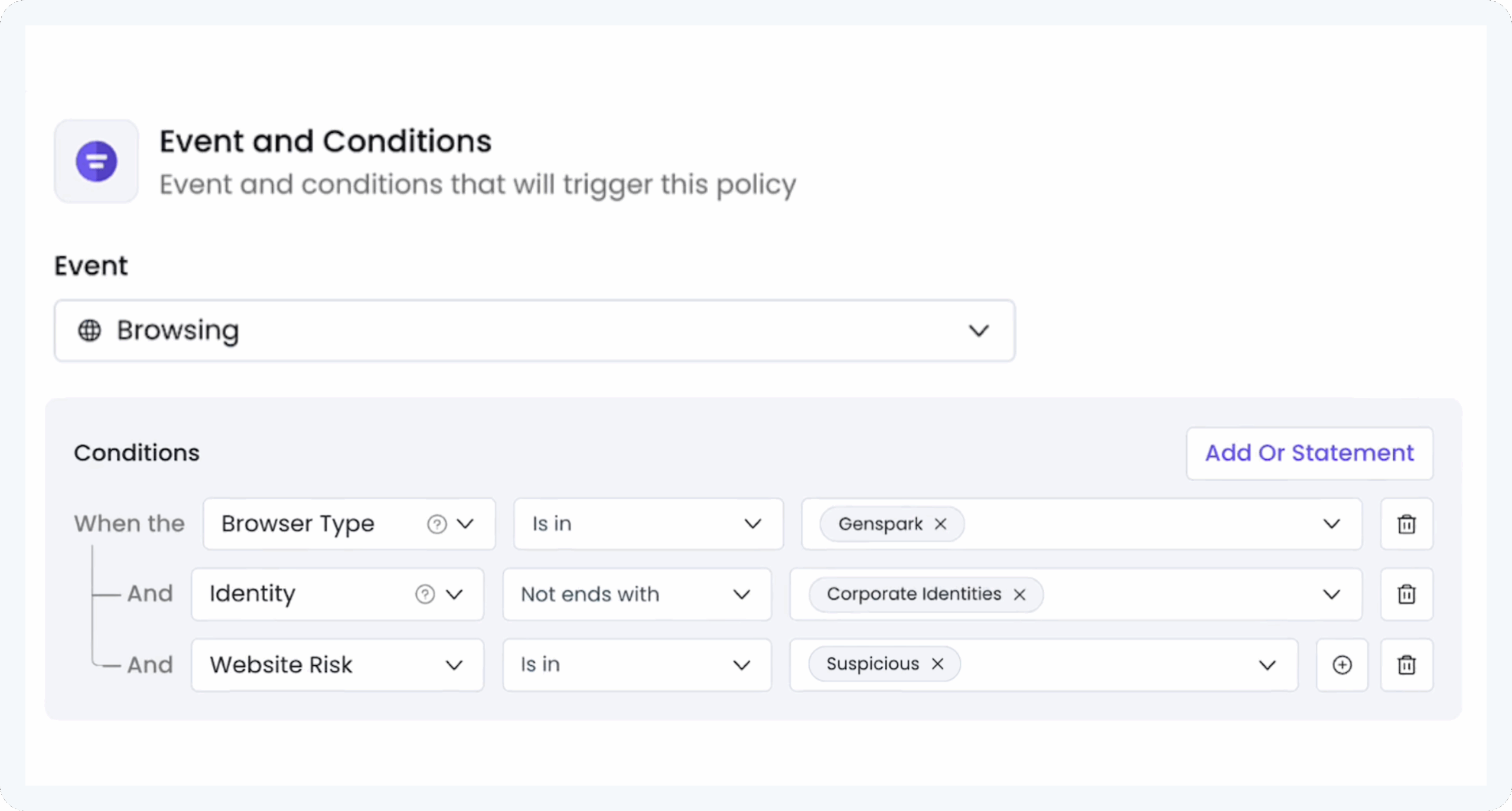 Apply granular policies to govern both human and AI-agent actions. Restrict data uploads, inputs, and sharing based on identity, data sensitivity, and contextual risk.