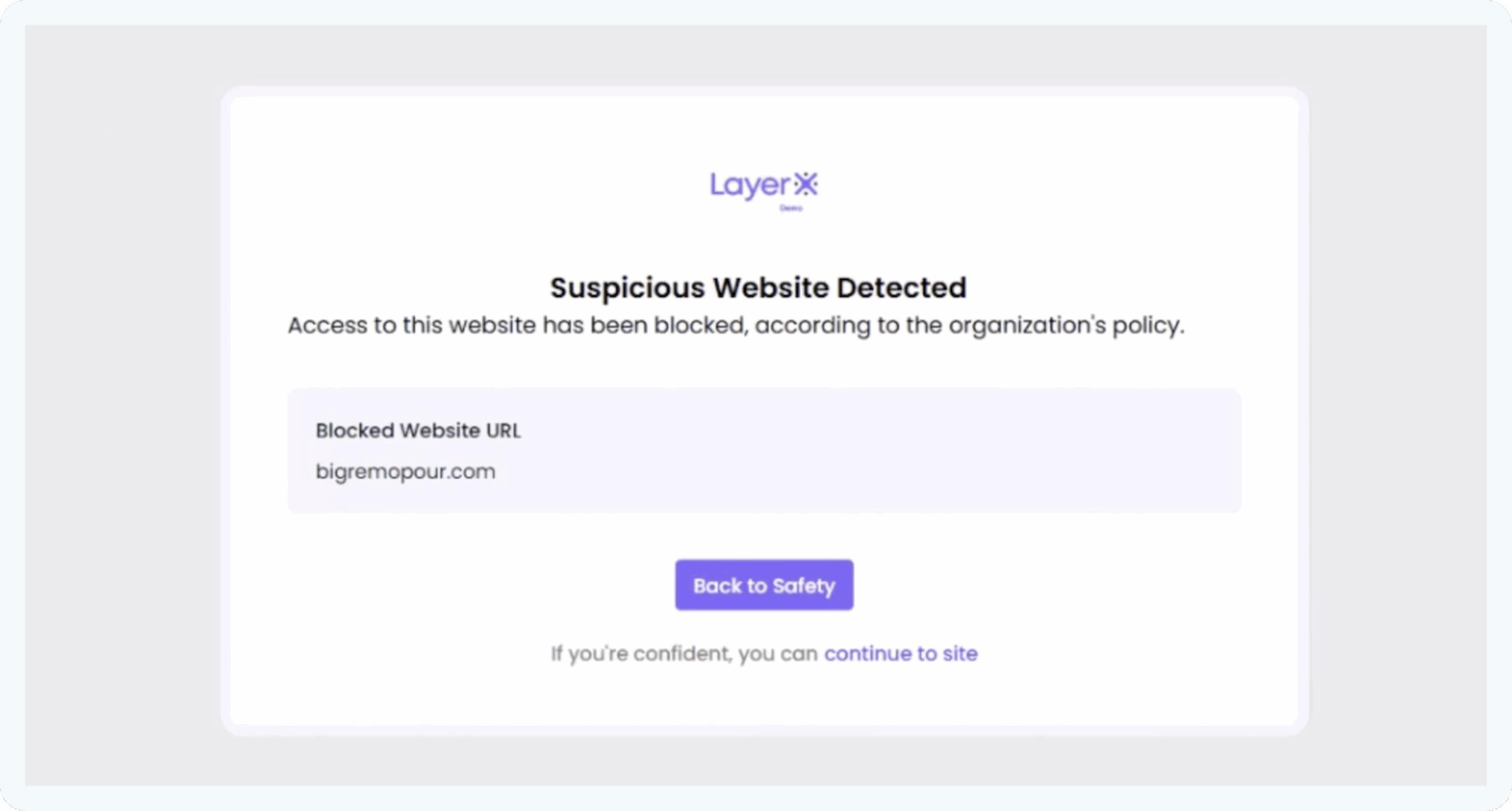 Leverage LayerX’s AI-powered risk engine to detect malicious web pages or attacks attempting to abuse embedded AI agents. LayerX blocks these threats instantly to safeguard users and corporate data.