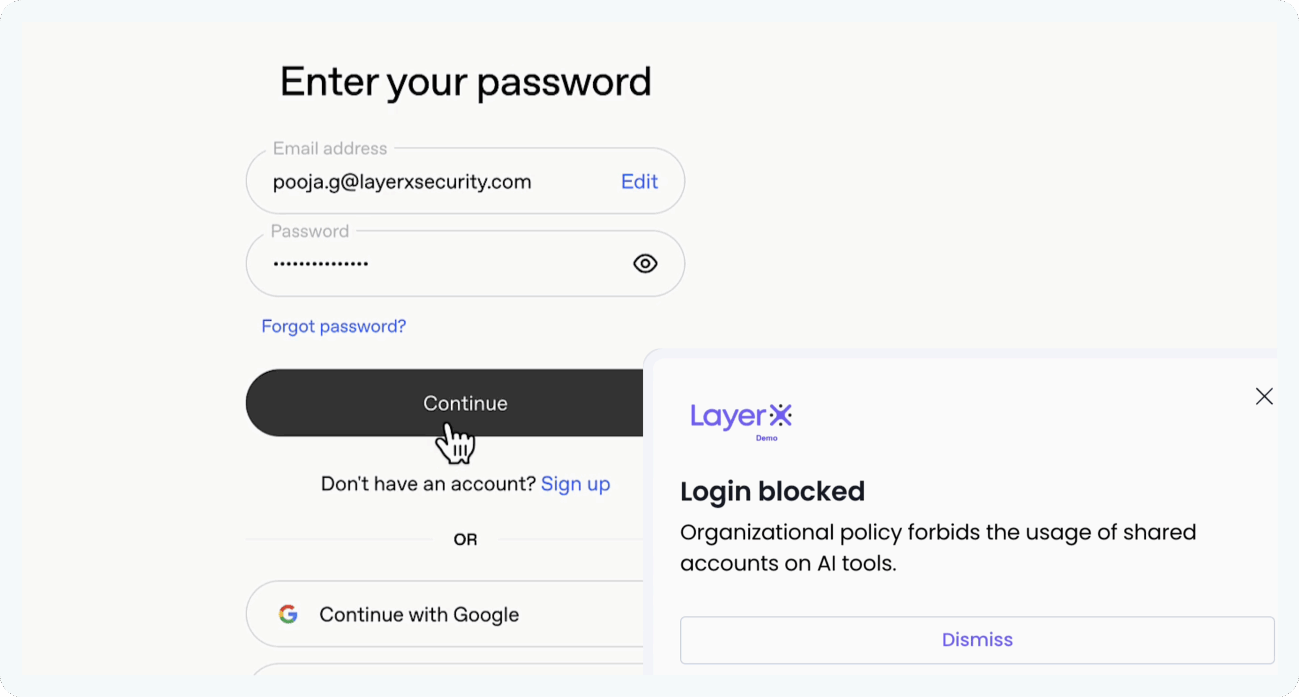 LayerX detects when multiple users log in with the same credentials and enforces controls to ensure only authorized users can interact with sensitive AI environments. This prevents insider risks from unauthorized access and shadow usage, closing a common gap in AI governance and compliance.