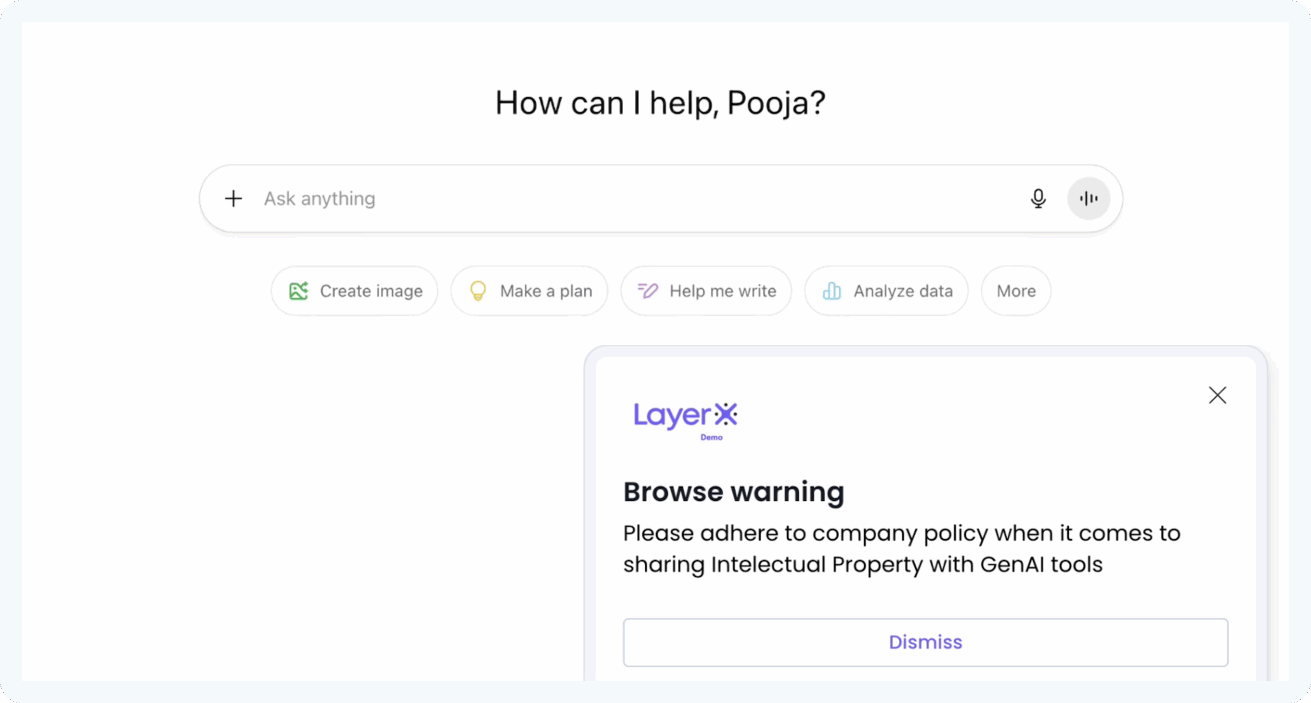 LayerX helps security teams balance protection and productivity by contextual warning messages and links to company policies when they access GenAI tools. These reminders reinforce responsible AI use and raise awareness without disrupting workflows.