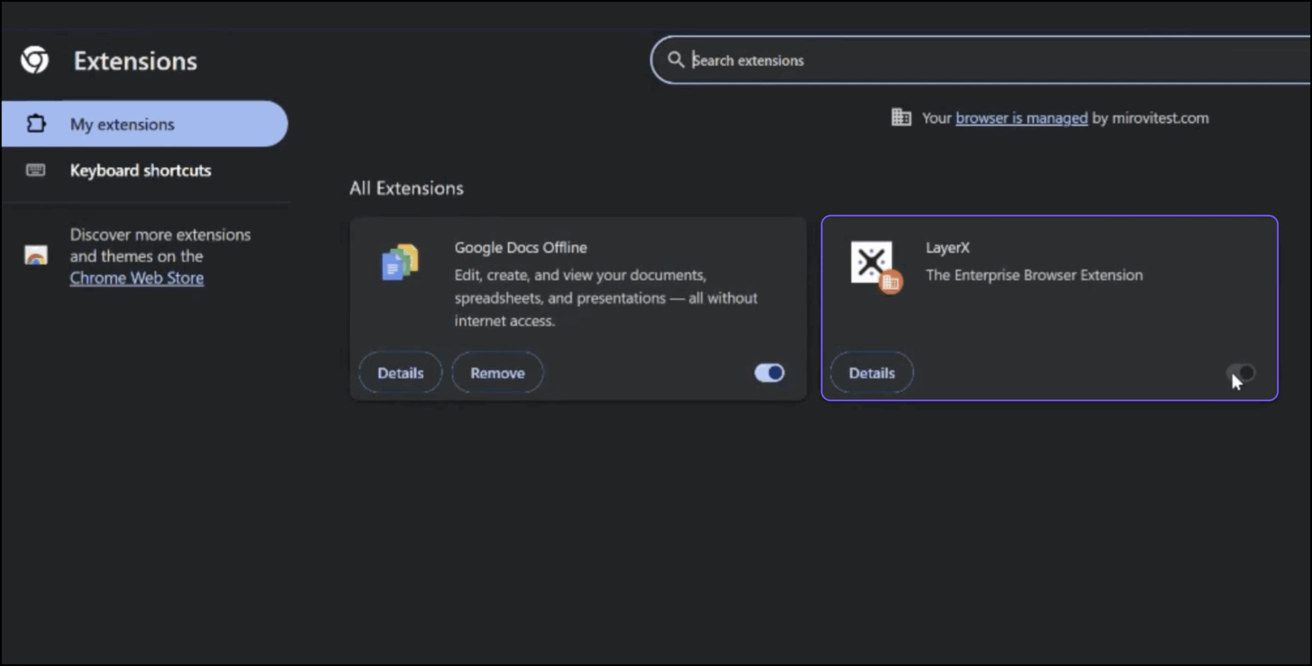 LayerX can be deployed on unmanaged devices either as a lightweight browser extension or as an integrated “enterprise” browser, with the LayerX extension built-in. LayerX currently supports Chrome, Edge, Safari and Firefox. This approach allows organizations to deploy a hardened standalone browser, without having to switch or train users on the new environment, while still enjoying the benefits of LayerX’s security platform.