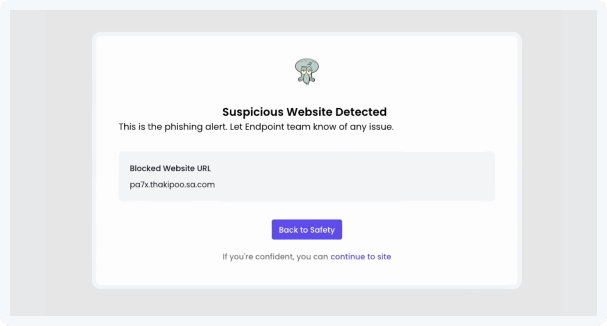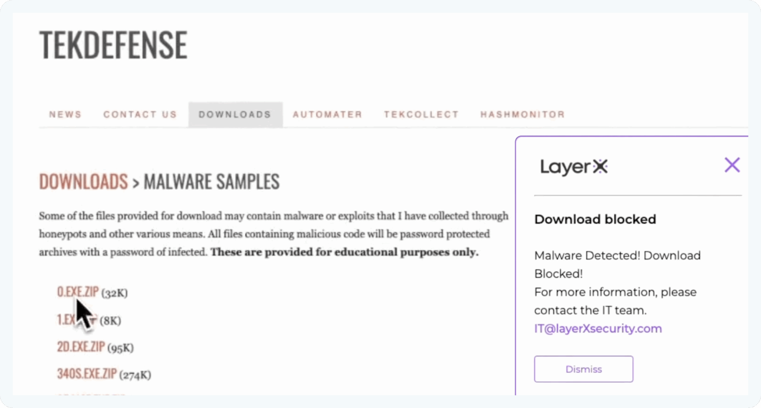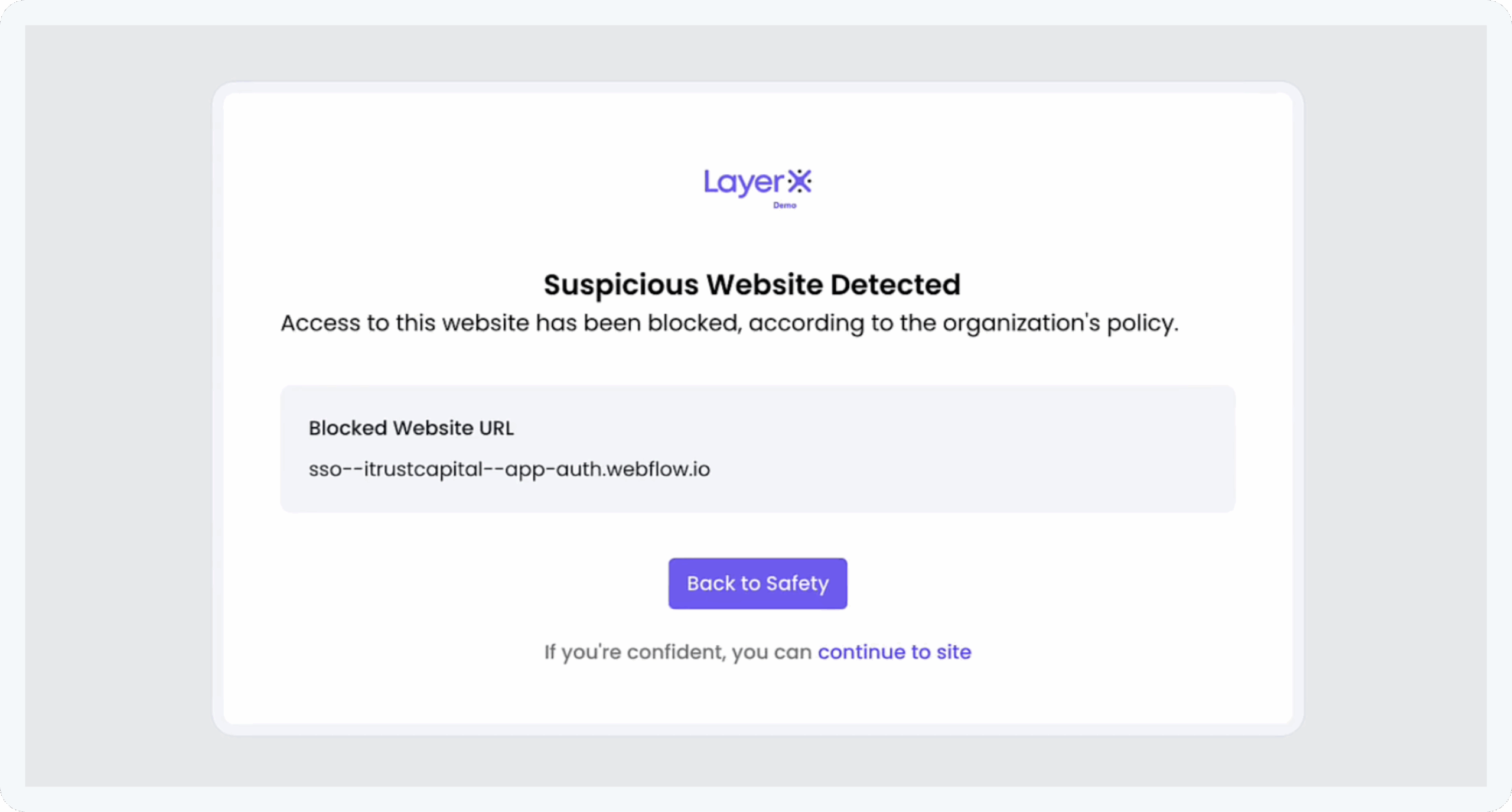 Request a Demo See LayerX in ActionWarn or automatically block users from interacting with malicious web pages, including phishing, social engineering, and malware sites, before damage occurs.